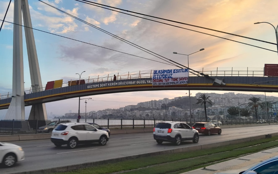 İzmir’de Özel Sektör Öğretmenleri Sendikası, Güzelyalı sahilinde bulunan Göztepe Köprüsü’ne astıkları pankart ile kamudaki meslektaşları gibi indirimli öğretmen ulaşım kartı hakkı taleplerini dile getirdi. Öğretmenler, konuya ilişkin daha önce görüşme gerçekleştirdikleri İzmir Büyükşehir Belediye Başkanı Tunç Soyer’e “Sözünü tut Tunç Soyer” ifadeleriyle seslendi.